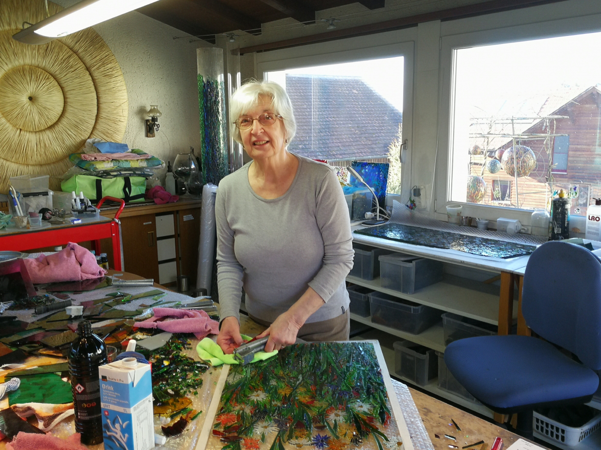 Immer wieder setze ich das Glas auf eine andere, ungewohnte Weise ein. Mich interessiert das Zusammenspiel von Glas, Farben und Licht. Ein Objekt im Freien wirkt immer wieder anders, abhängig vom Sonnenstand und der Umgebung. Trifft beispielsweise violettes Glas auf grüne Blätter, wirkt das Glas braun. Wird ein Glasfenster von aussen von der Sonne beleuchtet, verzaubern wunderbare Lichtreflexe den Raum. Im Freien werden Lichtreflexe der Gläser auf den Boden reflektiert.