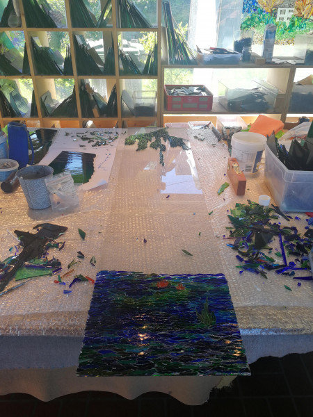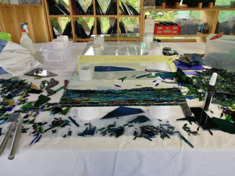 Wenn ich ein Glasstück gelegt habe, kann ich es nicht mehr wegnehmen, der unsichtbare Klebstoff ist fest, die Verklebung glasklar. Ein unsichtbarer Klebstoff bindet auch uns an dieses einmalige, kostbare Leben, in dem immer der aktuelle Moment der Wichtigste ist. Wir leben Schritt für Schritt, ich glase Scherbe für Scherbe. Und manchmal, wenn ich am Schluss ein Objekt von der Rück- oder Innenseite her, also spiegelverkehrt, betrachte, sehe ich: Der Verlauf der Scherben hat sich stimmig ergeben. Und ich frage mich, ist das Versöhnung?